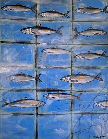 Stærð: 30x30 cm. Tækni: Akrýl, krít og túss á striga.