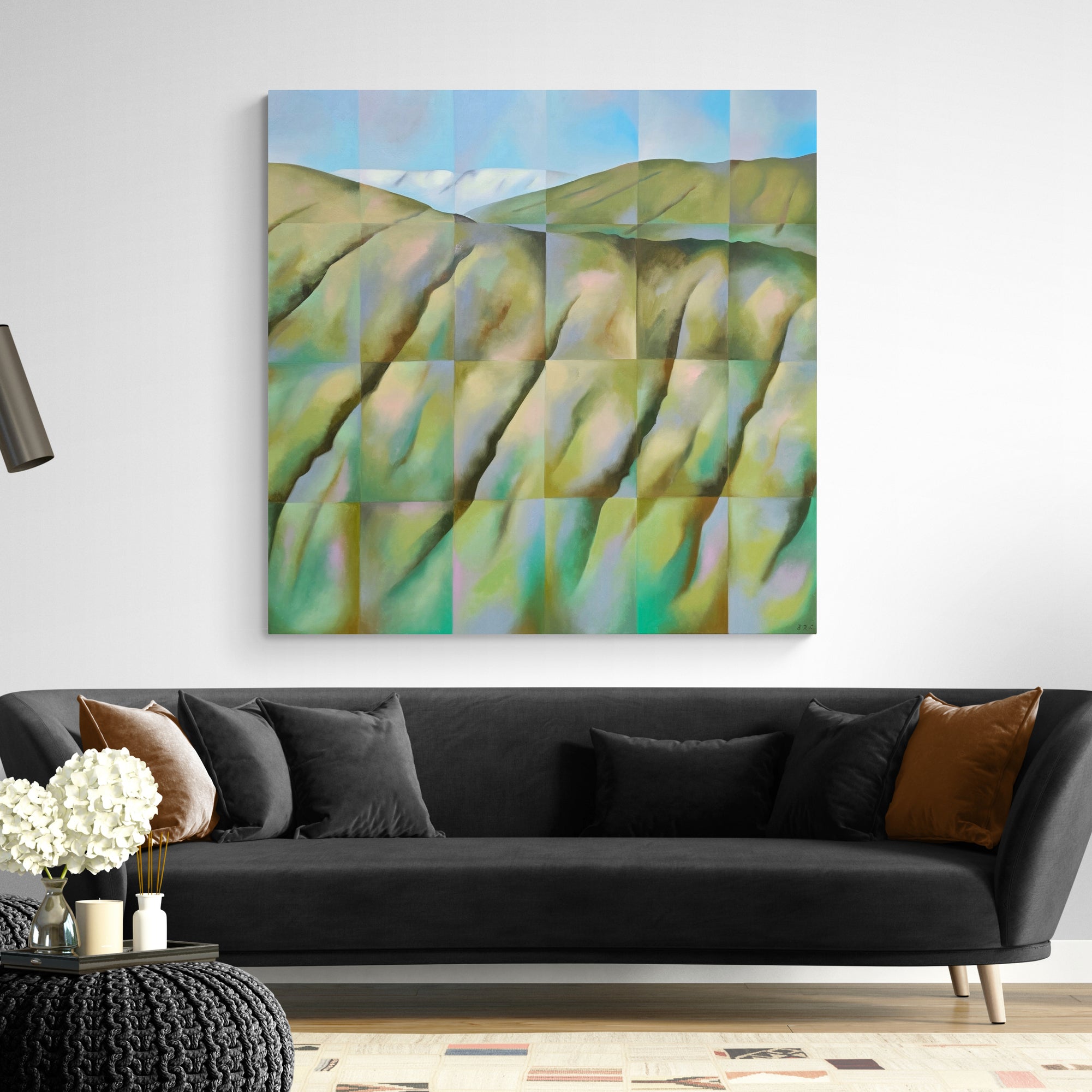"Birgir Rafn hefur til fjölda ára verið að vinna með landslag saman með grunnformunum, þríhyrningi, hring og ferhyrningi. Ferhyrningsformið er eitt stífasta formið, eða eins og Birgir Rafn vil kalla það "það harðbyggðasta" og mest concret af þeim þremur. Og auðvitað tengjum við í dag við ferhyrningsformið sem sprelllifandi og virkt. Ein augljósasta mynd þess - fyrir utan endalaus kassahús alls staðar - er til að mynda hvernig menn reyna að skilgreina allt og einmitt setja í kassa. Þessi endalausa skilgreiningarþörf er sem gleraugu sem fólk gengur með á nefinu, sér, heyrir og hlustar með, upplifir sjálft sig, aðra og umheiminn. Birgir Rafn hefur lengi verið að gera myndir byggðar á þessum forsendum, sem einskonar sjónræna rannsókn á eðli grunnformanna. Þar er landslag oft brotið upp í reglulega ferhyrninga, hver reitur eins og mynd í sjálfu sér, sem leggur sitt til heildarmyndarinnar. Og hver reitur verður þannig meira en hann sjálfur er, tengdist heildinni. Hver og einn bútur er þannig eins og afstæð mynd í sjálfu sér, en saman mynda þeir einstaka heild. Kannski Birgir Rafn sé að minna á að heildir eru einstakar einmitt út af hverjum og einum þeirra sem lifandi leggja til heildarinnar. E.t.v. mætti spyrja hvort heildin sé nokkurn tíma mikilvægari en hinn einstaki sem leggur einmitt sitt einstaka og sérstaka til heildarinnar? Já myndina er erfitt að skilgreina."