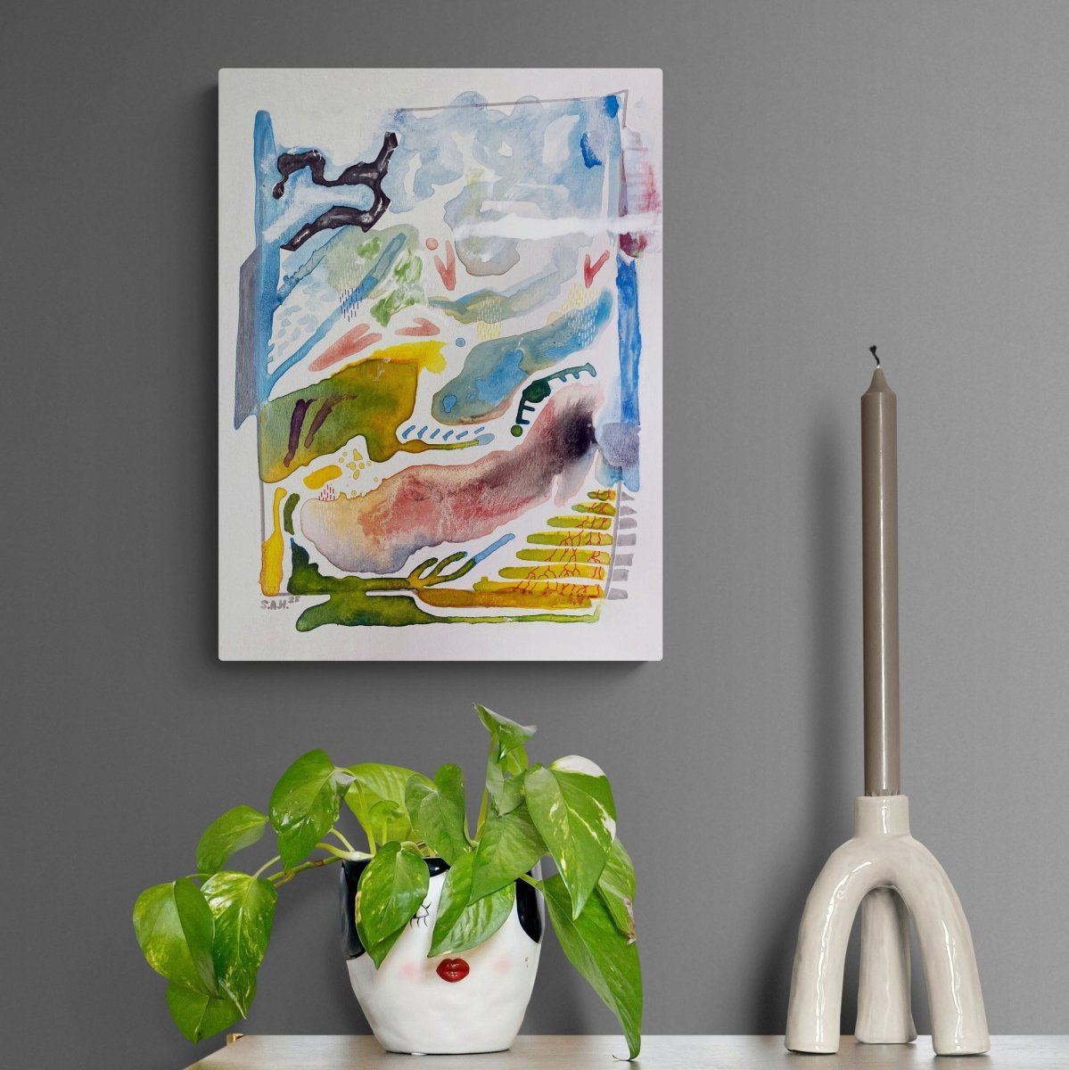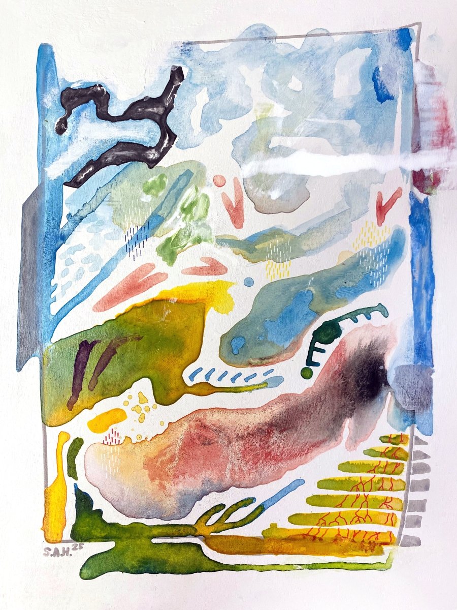 "Verkið er partur af seríu þar sem listamaður notar akrýlblek á spónarplötu. Platan er grunnuð með hvítri innanhússmálningu, til að loka viðnum, og svo bætast við mörg lög af bleki sem þurfa öll að þorna inn á milli. Þannig fæst marglaga áferð sem er full af dýpt og smáatriðum sem koma sífellt betur í ljós."