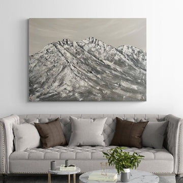 Stærð: 100x140 cm. Tækni: Akrýl á striga. "Fjöllin geta minnt okkur á að allar áskoranir, stórar sem smáar, eiga það sameiginlegt að þurfa þrautseigju og trú á eigin getu. Þetta verk fangar augnablikið þegar þú stendur á toppnum eftir erfitt...
