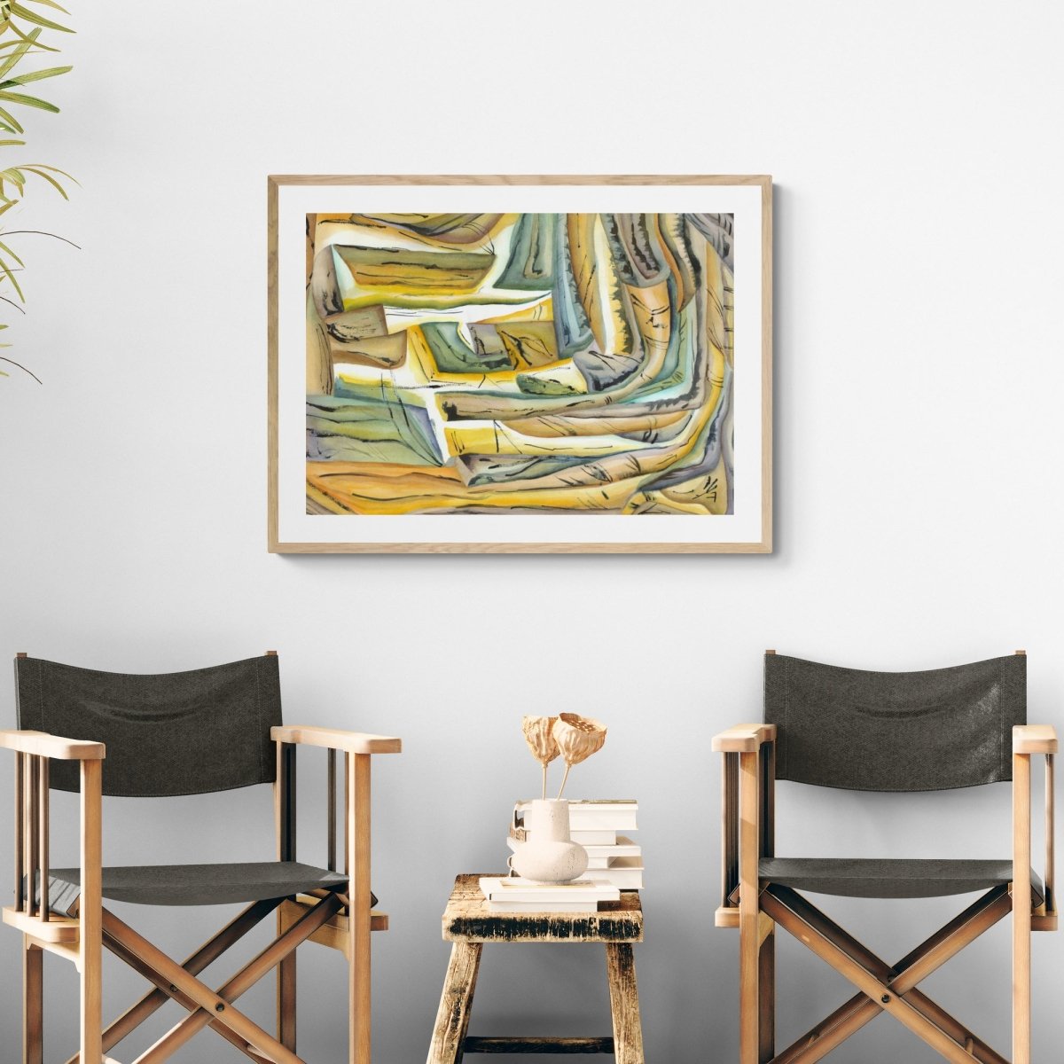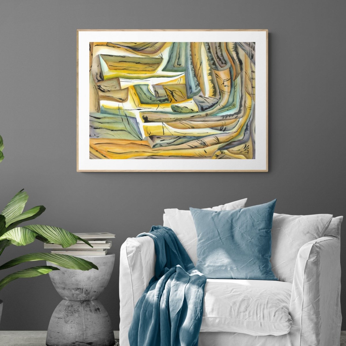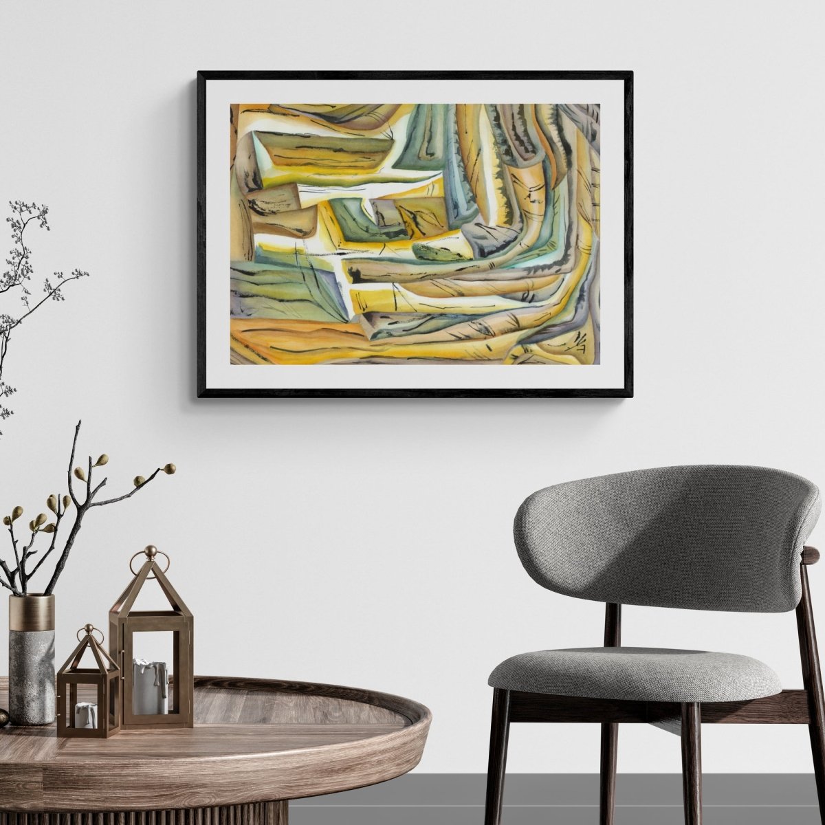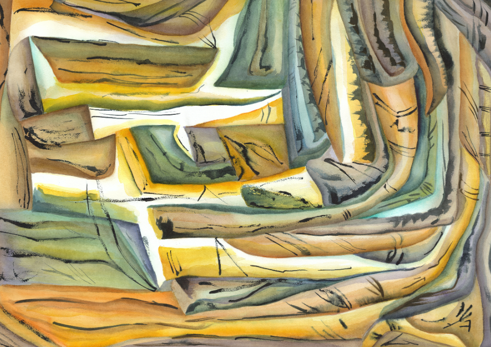 "Sveigð form og dökkar línur móta rými þar sem lög og straumar þrýstast áfram. Verkið byggir á samspili hlýra og kaldra tóna, þar sem hreyfing, áferð og teiknilegar íhlutanir halda formunum saman."
